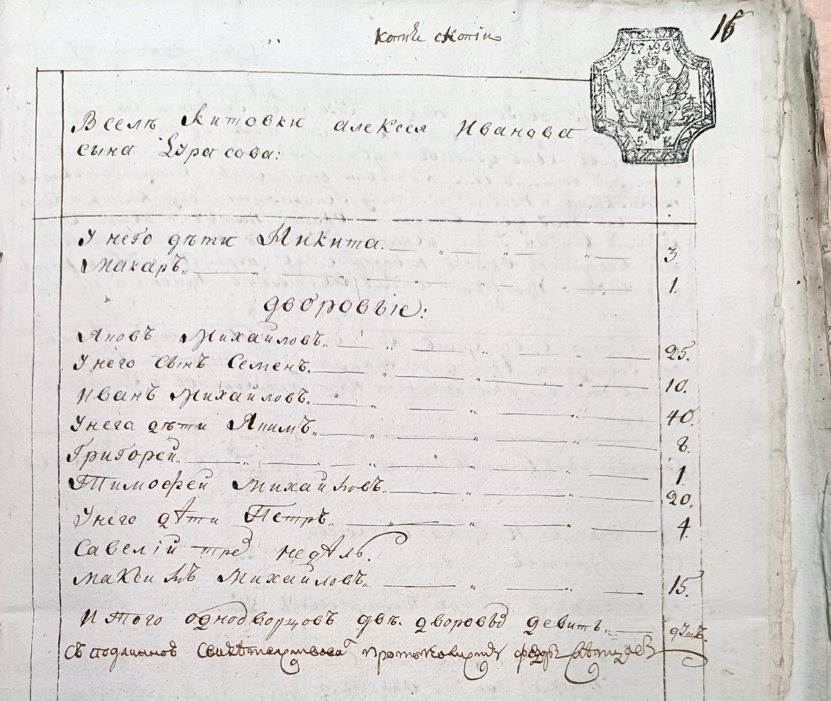 В деле о дворянском достоинстве Андрея Дурасова имеется выпись из сказок первой ревизии по имению его деда Алексея. На выписи указано «копия