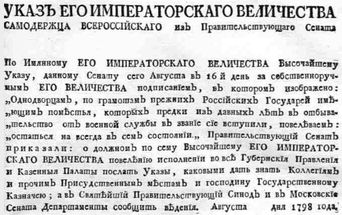 и внешней политики. 16 августа 1798 года вышел Указ императора Павла I «Об оставлении однодворцев, имеющих поместья, навсегда в сем звании». Документ был издан в ответ на требования крупных помещиков, которые были не заинтересованы в повышении социального статуса однодворцев, и был направлен на ограничение землевладения однодворцев и запрет на переход в другие сословия. Как указывает К.К. Билеуш в статье «Правовой статус однодворцев: проблемы и противоречия» (Historia provinciae – журнал региональной истории. 2023. Т. 7.): «само однодворческое состояние являлось неоднородным: с одной стороны, встречались однодворцы, которые записались в этот статус из дворян, а соответственно, в их собственности были земли и крестьяне, а с другой стороны, были однодворцы, которые наделялись землей из состава казенных земель для содержания ландмилицких (пограничных) полков»». При этом не уничтожались подтверждённые межевой инструкцией права однодворцев на особые земли, принадлежавшие предкам по дачам или приобретённые ими самими по прежним законам.